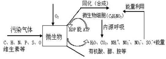 (3)进入微生物细胞的恶臭成分作为营养物质为微生物所分解、利用,从而使污染物得以去除。