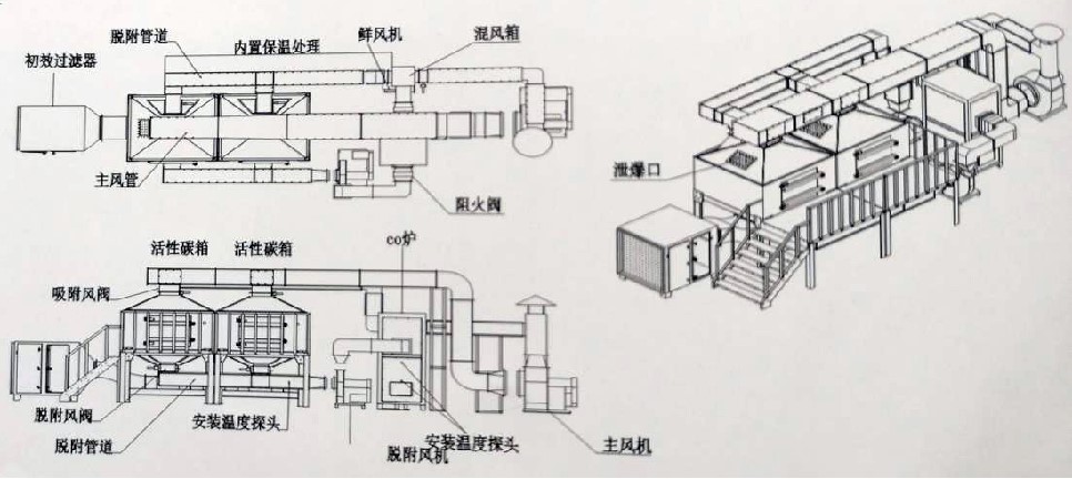 吸附浓缩催化燃烧,是指将中低浓度(200~500mg/m³)废气经过活性炭吸附后,再经过蒸汽/热风脱附,脱附后的高浓度废气进行催化燃烧的工艺。